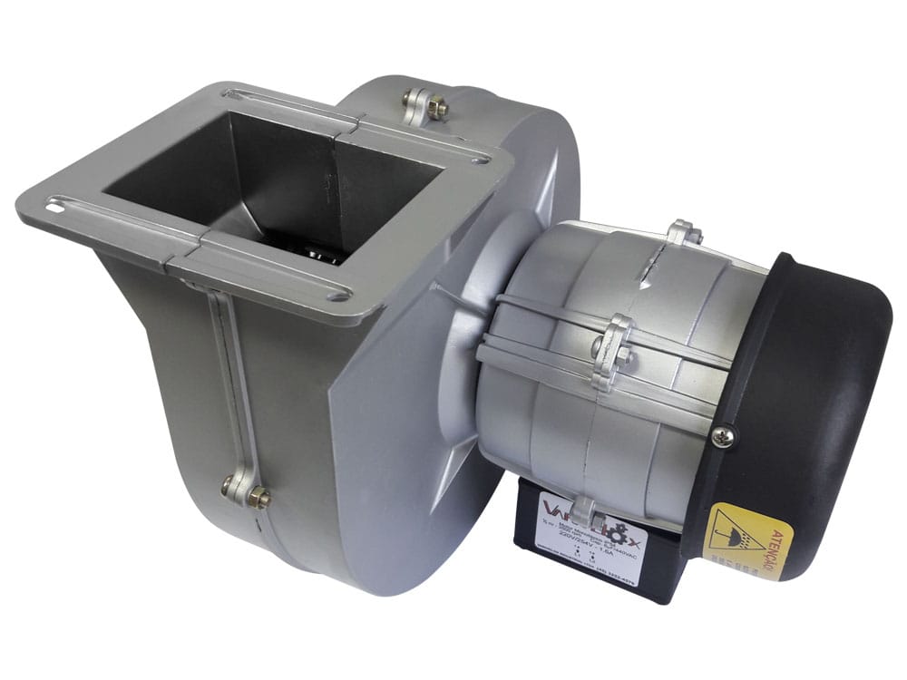 Ventilador Siroco Varivelox, possui motor 1/3cv, 2 polos, 3500rpm, disponível na versão Monofásica e na trifásica, carcaça em alumínio injetada, opções de rotor injetado em nylon com fibra ou em Aço, vazão máxima de 12m3/mim, pressão máxima 60mmca, o conjunto possui uma massa de 6kg.